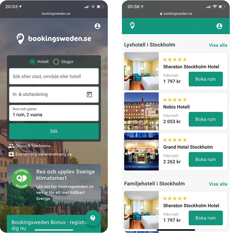 Vi har designat gränssnittet för den svenska bokningstjänsten Bookingsweden.se samt haft en drivande roll i det fortsatta arbetet och vidareutvecklingen av tjänsten. Vi tror att ärlighet varar i längden och har därför utformat tjänsten med ambitionen att förmedla en trovärdighet och pålitlighet för tjänsten genom att vara ärliga i erbjudandet gentemot slutkund.